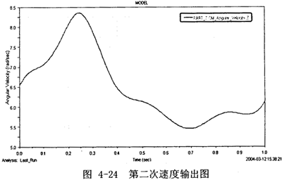 (2)在Adams下建立的樣機(jī)模型里,將上述V2(2)速度函數(shù)設(shè)置到第二輸入中,設(shè)置好后,進(jìn)行仿真。得到輸出速度曲線,如圖4-24所示。