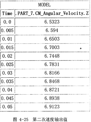(3)同樣,將上述輸出速度圖每隔0.005秒采樣一次,得到一組輸出速度值的離散數(shù)據(jù),以數(shù)據(jù)文件格式輸出,如圖4-25所示(截取0.05秒內(nèi))。