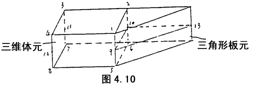 如圖所示,我們以12節(jié)點體元來模擬螺孔中心帶磨擦部分的疊片實體,右邊為三角形板元,其中第9、第10兩個節(jié)點為三維體元和三角形板元共享的節(jié)點,這樣就可以將兩個部分結(jié)合在一起了。