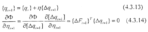 在求解方程(4.3.8)時,,尋求一個n 階矢量{q } ,實際上是在n 維空間找到一個方向和步長來滿足該方程。對于非線性方程組,要經(jīng)過多次迭代,每次迭代均要找到一個方向和步長,逐步達到平衡解,為了加速迭代的收斂,在由式(4.3.12)決定的力向上尋求一個優(yōu)化的步長,即將{△q}乘以某一標(biāo)量η而使迭代加快。決定η 的原則是使能量增量φ最小化,即: