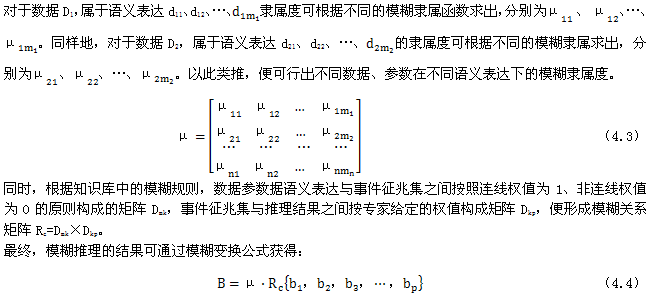 第三層為推理結(jié)果層。每個事件輸出Ei與推理結(jié)果Fj之間都有連線并賦有權值,參照模糊推理,推理結(jié)果為: