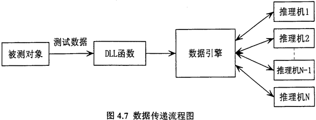 根據(jù)流程圖可知,從故障測試數(shù)據(jù)到數(shù)據(jù)引擎,有兩種數(shù)據(jù)處理方式,一種是故障測試數(shù)據(jù)由數(shù)據(jù)采集系統(tǒng)采集后,可先進行預處理,將故障信號數(shù)據(jù)處理為推理機所需的故障特征數(shù)據(jù),然后發(fā)送出去,動態(tài)連接庫DLL函數(shù)則通過網(wǎng)絡接收這些故障特征數(shù)據(jù),同時對照推理機向數(shù)據(jù)引擎申請的故障特征變量,將申請的故障特征變量對應的值找出,按數(shù)據(jù)引擎規(guī)定的格式反送給申請數(shù)據(jù)的推理機。另一種是故障測試數(shù)據(jù)由數(shù)據(jù)采集系統(tǒng)采集后,按一定格式直接發(fā)送出去,動態(tài)連接庫DLL函數(shù)則通過網(wǎng)絡接收這些故障信息數(shù)據(jù),然后再進行數(shù)據(jù)預處理,將故障信息數(shù)據(jù)處理為推理機所需的故障特征數(shù)據(jù),同時對照推理機向數(shù)據(jù)引擎申請的故障特征變量,將申請的故障特征變量對應的值找出,再按數(shù)據(jù)引擎規(guī)定的格式反送給申請數(shù)據(jù)的推理機。