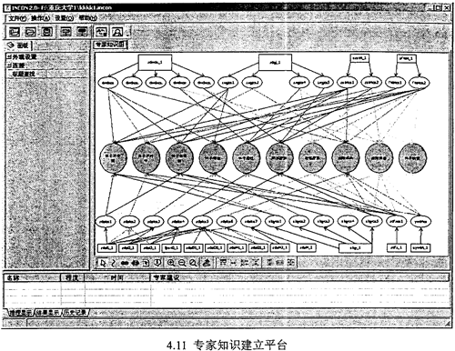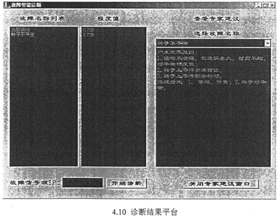 根據(jù)給出的數(shù)據(jù)端口及數(shù)據(jù)格式,即可按用戶的要求設計診斷結(jié)果輸出平臺。診斷結(jié)果應給出診斷故障的名稱、故障發(fā)生的部位,故障發(fā)生的時間及程度。對于不同的故障,提示故障發(fā)生的可能原因,給出相應的專家建議或維修方法等。圖4.10為本文集成系統(tǒng)的診斷結(jié)果輸出用戶界面。圖4.11為本文集成系統(tǒng)的專家知識庫建立及診斷推理平臺。