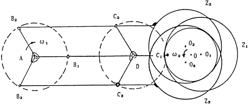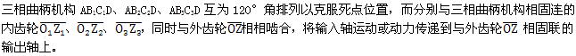 眾所周知,雙曲柄機構的最大缺點就是存在死點位置,即當曲柄,與連桿共線時,機構處理運動不確定位置,其傳動角為零,機械無法運動。為了克服死點位置,目前已出現(xiàn)了三種解決方法:其一是在同一行星輪上布置多套雙曲柄機構的方法:其二是采用雙曲柄動力輸入式方法;基三是采用多相并列式雙曲柄機構來克服死點的方法。三環(huán)減速器就是用三相并列雙曲柄機構來克服死點位置,如圖2-2所示。