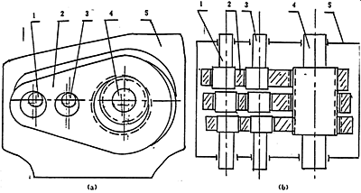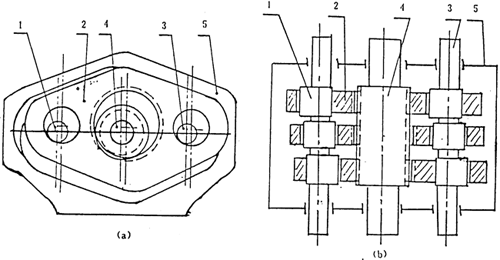 101型三環(huán)減速器基本構造如圖2-4(a)(b)所示。其輸出軸4位于輸入軸1和支承軸3之間,受力情況要優(yōu)于110型三環(huán)減速器。