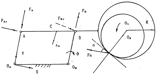 因Fn(Kπ)≠0,則當環(huán)板機構過死點位置時,該雙軸柄機構將在嚙合力Fn與輸入軸驅動力FAr的作用下產(chǎn)生反轉力矩,有可能在機構的該運動狀態(tài)的不確定位置ф=Kπ處由正向雙曲柄機構變成反向雙曲柄機構,而在此時,另兩套雙曲柄機構將通過轉臂軸與偏心套的鍵聯(lián)接處產(chǎn)生推動該環(huán)板過死點位置的作用力,克服其反轉,從而產(chǎn)生沖擊力FBr,否則FB、FA將趨向于無窮大,其物理意義為機構不可能通過死點。顯然,在ф=Kπ的死點位置的微小領域內,轉臂軸的二力桿假設不在再成產(chǎn)。沖擊力FBr的峰值由該時刻的動力學方程(2-10)可導出為: