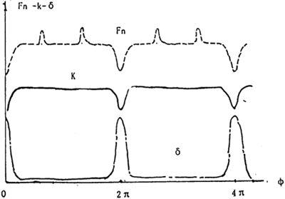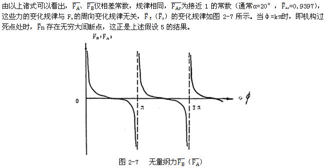 理論上,該力僅在ф=Kπ點產(chǎn)生,而FA、FB將在此點處趨于無窮大?紤]實際結構的彈性變形等因素,F(xiàn)Br應在ф=Kπ的一轉角領域內ф=Kπ±△ф產(chǎn)生,而FB、FA在該鄰域內由正(或負)向峰值過零轉變?yōu)樨摚ㄕ┫蚍逯,如圖2-10所示。這是因為FB、FA在死點位置附近迅速增大產(chǎn)生的彈性變形也會使環(huán)板產(chǎn)生微小反轉角度,而導致FBr的產(chǎn)生,顯然該微小角度領域的大小以及FB、FA所能達到的峰值決于環(huán)板的剛度。剛度越大,該領域越小,F(xiàn)B、FA峰值越大,F(xiàn)Br的大小與嚙合力及無量綱參數(shù)(γ+β)成正比。一般情況下,高速重載的三環(huán)減速器、環(huán)板機構的剛度嚙合力等均較大,因此死點處受到的沖擊越大,且沖擊脈沖寬度。ǚ幢扔诮撬俣龋,激振頻率更寬,更易激起廣泛的共振。