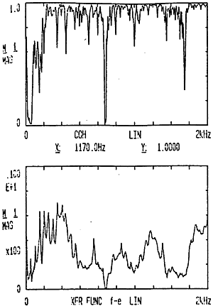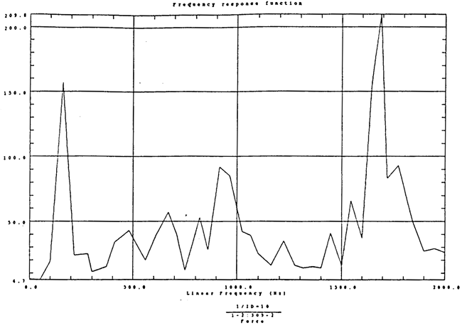 有了脈沖激勵(lì)信號(hào)和脈沖響應(yīng)信號(hào)后,CF-355頻譜分析儀就能計(jì)算出測(cè)點(diǎn)12X向由于14點(diǎn)X向激勵(lì)間的頻響函數(shù)H(ω)及其相干函數(shù),如圖4-5所示。圖4-6是頻響函數(shù)H(ω)的倒數(shù)。