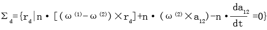 由(2-5-1)式知,它是r(1)、r(2)需滿足的微分方程。Σ1、Σ2在接觸的最初階段,接觸參考點(diǎn)在接觸力作用下,隨著Σ1、Σ2的相對(duì)運(yùn)動(dòng),變形逐漸增大,在此階段,不為零。當(dāng)接觸參考點(diǎn)變形達(dá)到最大時(shí),該瞬間變形結(jié)束,回彈尚未開始,顯然,此瞬時(shí),這時(shí)的接觸參考點(diǎn)為決定兩曲面運(yùn)動(dòng)關(guān)系的點(diǎn),受力達(dá)到平衡,我們稱這樣的接觸參考點(diǎn)為變形最大點(diǎn)。將這樣的點(diǎn)之徑矢記為rd(1)、rd(2),(2-5-1)式就成為