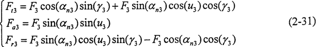顯然F1、F2、F3組成一空間匯交力系,假設活齒在每個工作瞬時處于衡狀態(tài),根據(jù)圖2-10中各作用力的空間位置關系,可列方程如下: