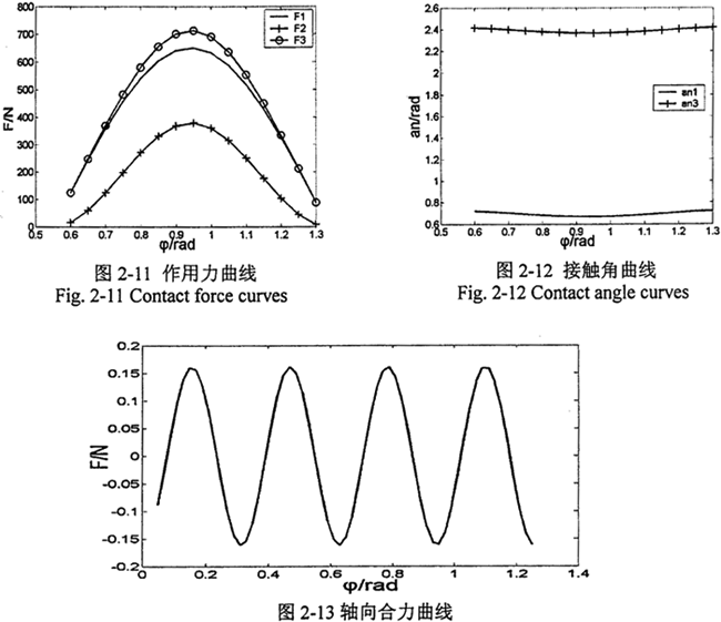 由圖2-11分析可知,在空間正弦軌跡曲線的拐點附近活齒受力最大,且作用在活齒上的三個力F1、F2、F3中,F(xiàn)3值最大,也就是說,在進行接觸強度計算的時候,應以活齒與殼體間的接觸情況為主要依據(jù)。接觸角αni(i=1,3)的求解為圓柱正弦活齒傳動的結構設計提供了必要的條件,它成為正弦滾過深度bi,(i=1,3)的主要度量依據(jù)。由圖2-13可以看出圓柱正弦活齒傳動主動軸上的軸向合力幾乎為零,且該傳動輸入軸的旋轉中心與其幾何中心重合,屬于自平衡結構,避免了慣性力的產生。因此只需采用單激波器的結構型式即可使慣性力和作用力達到平衡,縮短了傳動的運動鏈,減少了動力損耗,提高了傳動系統(tǒng)的效率和運動穩(wěn)定性。