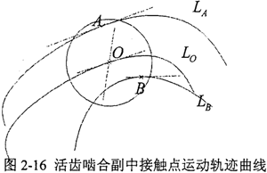 在圓柱正弦活齒傳動的一個活齒嚙合副中,活齒與殼體及主動軸的滾道分別在A、B點接觸,如圖2-16所示,接觸角近似取αn1=αn3=π/4,活齒在接觸點A、B的運動速度方向即為接觸點軌跡曲線LA及LB的切線方向,根據(jù)式(2-19),可知活齒與殼體接觸點A的運動軌跡曲線LA的方程: