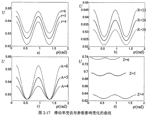 投影到瞬時接觸線的法線方向得到v10t和,v1t,將二者代入式(2-38),計算出滑動率。由于正弦滾道形狀具有周期性,因此共軛齒面間的滑動率也呈現(xiàn)周期性變化,考慮齒形參數(shù)——活齒半徑r、活齒中心回轉半徑R、正弦幅值A及殼體滾道正弦周期數(shù)Z對滑動率的影響,若給定其中任意三個參數(shù),改變另一個參數(shù),可以得到在一個工作周期內滑動率隨齒形參數(shù)的變化規(guī)律曲線如圖2-17所示。