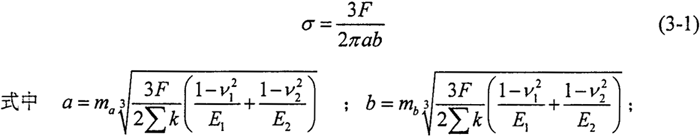 圓柱正弦活齒傳動的嚙合副在載荷作用下,活齒分別與主動軸的外滾道及殼體的內(nèi)滾道接觸,一般滾道半徑取r′= (1.04-1.11)r,r為活齒半徑;铨X與滾道的接觸問題,可看作兩自由曲面體的彈性接觸問題,根據(jù)赫茲(Hertz)應力理淪,在外加總載荷F作用下兩自由曲面彈性體的接觸應力計算公式為