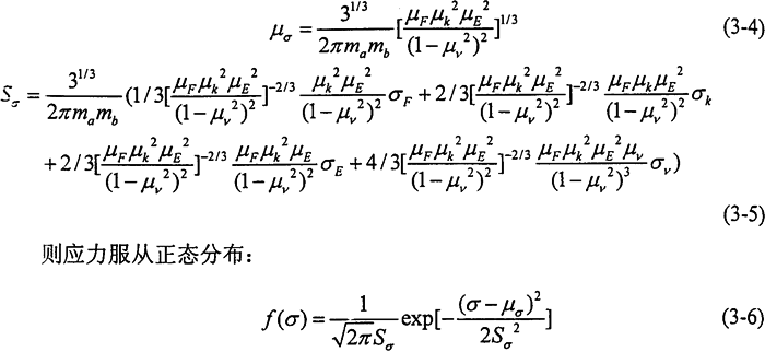 將F、∑k視為隨機變量,并近似按“3σ”法求出其均值μF、μk與標準差SF、Sk,根據(jù)文獻,彈性模量E、泊松比v均為隨機變量,且近似服從正態(tài)分布,彈性模量的變異系數(shù)對鋼而言不超過0.03,即彈性模量的標準差為6180MMPa,而泊松比的變異系數(shù)一般在2%-3%左右,則泊松比的標準差為0.009。按可靠度計算的一次二階矩原理,將齒面接觸應力的表達式在基本變量的平均值點處展開成泰勒級數(shù),僅取級數(shù)的線性項,則可近似求得應力的均值μa與標準差Sσ分別為:
