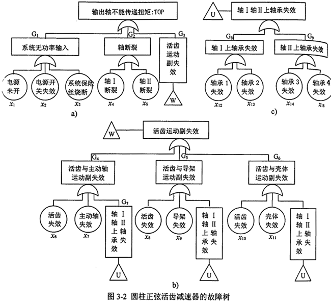 在系統(tǒng)可靠性研究方法中,故障樹分析(FTA)是一種用于復雜系統(tǒng)可靠性和安全性分析的有效方法,F(xiàn)TA是一種圖形演繹方法,能通過對可能造成系統(tǒng)故障的多種因素(包括軟件、硬件、環(huán)境、人為因素)進行分析,畫出邏輯框圖即故障樹,從而確定系統(tǒng)故障原因的各種可能組合方式或其發(fā)生概率。本章在分析圓柱正弦活齒減速器系統(tǒng)結構及功能關系的基礎上,建立圓柱正弦活齒減速器的故障樹,確定了系統(tǒng)的最小割集。將模糊數(shù)學引入傳統(tǒng)的故障樹分析中,根據(jù)建立的故障樹中各事件的邏輯關系,采用模糊數(shù)的運算法則及模糊算子AND和OR計算出系統(tǒng)以“輸出軸不傳遞扭矩”為故障的模糊概率值。