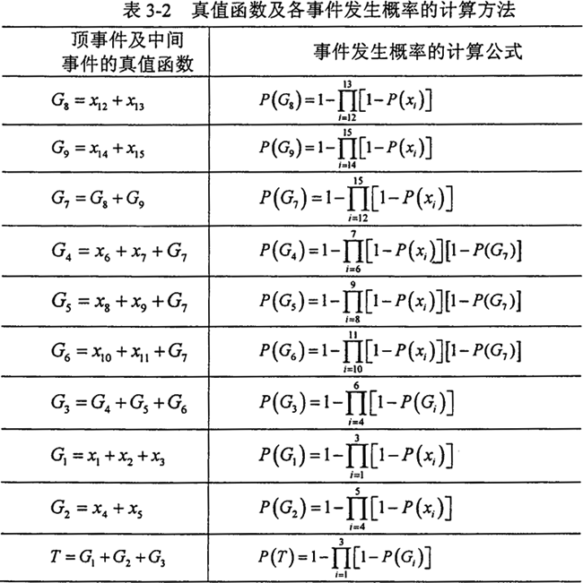 故障樹的定量分析是運用故障樹中建立的邏輯關系,根據(jù)底事件發(fā)生的概率推導出頂事件發(fā)生的概率,從而對系統(tǒng)的可靠性、安全性作出評價。故障樹中各種事件間的因果關系用各種“門”來描述,并且大多可以等效為邏輯“與門”和“或門”。根據(jù)“與門”和“或門”所表示的事件關系,并假設各個事件互相獨立,根據(jù)表3-2即可計算活齒減速器中各中間事件和頂事件的發(fā)生概率。