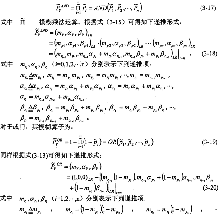 3.3.3.1模糊分析的理論基礎 在故障樹的模糊分析中,采用模糊數(shù)來描述事件發(fā)蘭的概率。模糊數(shù)是由概念上的模糊性或各種模糊因素的影響而造成定量處理時的不確定性。以模糊數(shù)描述概率值,帶有人的主觀性,強調(diào)了人在系統(tǒng)可靠性分析與評價中的重要性。因此,故障樹的模糊分析不僅可減少獲取事件發(fā)生概率精確值的難度,而且能結合工程中的實際經(jīng)驗和判斷構造模糊數(shù)為隸屬函數(shù),較準確地把它們描述出來,并在一定程度上允許存在描述誤差,具有較大的靈活性和適應性。