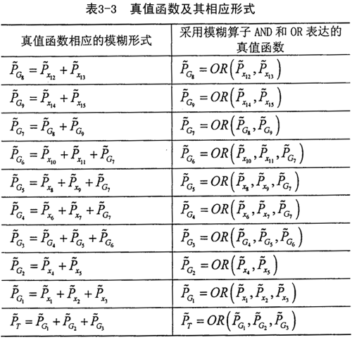 3.3.3.3圓柱正弦活齒減速器故障樹分析 根據(jù)圓柱正弦活齒減速器故障樹,用模糊算子ACD和OR描述基本事件間的邏輯關系,生成值值函數(shù)的模糊形式及用模糊算子表達的形式見表3-3。