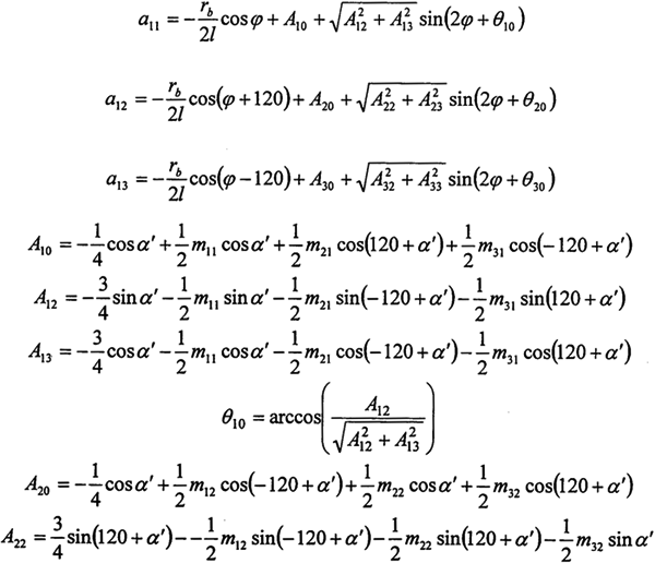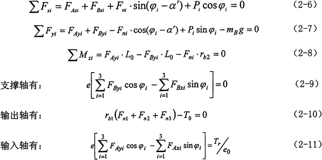 由上式可看出,任意時刻各環(huán)板上作用的嚙合力是不相等的,且是與轉(zhuǎn)角、環(huán)板和曲柄軸結(jié)構(gòu)尺寸、壓力角以及偏心尺寸有關(guān)的復(fù)雜函數(shù),假設(shè)各嚙合力相等或者是成一簡單的函數(shù)關(guān)系都是與實際嚴格不符的。若需要用簡潔的函數(shù)關(guān)系加以描述,應(yīng)首先利用上式求出輸出軸旋轉(zhuǎn)一周時的數(shù)個嚙合力的表達式,這里不作詳細的討論。
