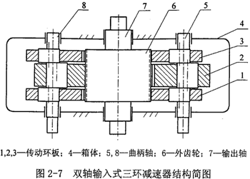 完全平衡雙軸輸入式三環(huán)式減速器如圖2-7所示。其工作原理為:三環(huán)式減速器的曲柄軸在動(dòng)力的驅(qū)動(dòng)下同步旋轉(zhuǎn),傳動(dòng)環(huán)板上的內(nèi)齒圈與輸出軸上的外齒輪相互嚙合,形成了大傳動(dòng)比,從而實(shí)現(xiàn)了減速及動(dòng)力傳遞。雙軸同步輸入可以克服傳動(dòng)機(jī)構(gòu)的死點(diǎn)問(wèn)題。