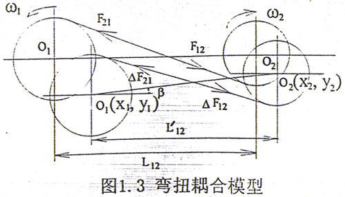 齒輪是機械系統(tǒng)中一個非常重要的部件,主要用于傳遞轉(zhuǎn)子之間的運動。對于外齒輪耦合轉(zhuǎn)子軸承系統(tǒng)的研究已經(jīng)進(jìn)行了數(shù)十年[14],比較典型的模型有Fukuma[15]、IWATSUBO[16]、Kahraman[17]模型和彎扭耦合模型[18],其中[15,18]中的模型分別如圖1.2和圖1.3所示。這些模型的共同特點是將嚙合的輪齒看成能夠產(chǎn)生變形的彈簧,同時考慮了齒輪中心的橫向位移和繞中心轉(zhuǎn)動的扭轉(zhuǎn)角位移,這樣對一個外齒輪而方Fukuma[15]模型就具有三個自由度,一對嚙合的外齒輪共有六個自由度;而彎扭耦合模型[18]則考慮了齒輪之間的嚙合關(guān)系,這一關(guān)系相當(dāng)與給系統(tǒng)增加了一個約束,使得系統(tǒng)的自由度減少了一個,因此是一個五自由度模型。
