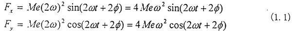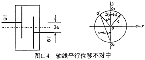 不對中具有一些典型的特征,如不對中比較嚴(yán)重時會使軸承的油膜壓力偏離正常值,聯(lián)軸器不對中時聯(lián)軸器兩端軸承的振動較大,軸心位置不穩(wěn)定,而且在振動頻譜中二倍頻分量幅值較大等。而對于齒輪聯(lián)軸器不對中產(chǎn)生倍頻振動分量的機理研究又是其中的一個重點。文獻(xiàn)[68]指出,由于安裝時轉(zhuǎn)子軸心線不對中引起的振動,在用電機驅(qū)動的轉(zhuǎn)子系統(tǒng)中,當(dāng)電機軸與負(fù)載機械由齒輪聯(lián)軸器連接時,電機軸存在二倍頻的振動,而在單獨運動時,倍頻振動立即消失,這表明倍頻振動完全是齒輪聯(lián)軸器耦合的結(jié)果。文獻(xiàn)[64,65]解釋了由于齒輪聯(lián)軸器不對勁中而產(chǎn)生二倍頻振動的機理,以[65]中的軸線平行位移不對中為例見圖1.4,圖中ω為轉(zhuǎn)子的轉(zhuǎn)動的解速度,2e為不對中量,M為內(nèi)齒套的質(zhì)量,φ0為起始回轉(zhuǎn)角。