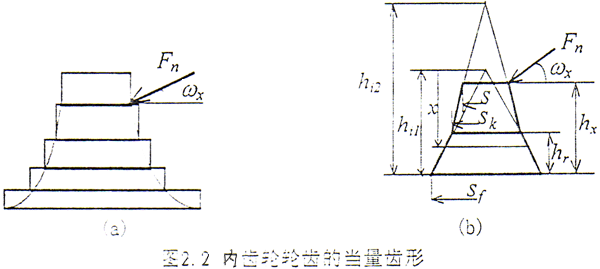 本文將輪齒的齒廓劃分為二個梯形,用二個梯形的彎曲變形、剪切變形、由輪齒基體的彈性傾斜所引起的輪齒的的變形以及輪齒的材料壓縮變形來模擬內齒的輪齒變形,故稱之為二梯形當量齒形法。這樣處理與Marmol的方法相比更接近實際的齒廓形狀,而且與外嚙合輪齒的梯形加矩形模型正好對應。下面就介紹二梯形當量齒形法,將內齒輪輪齒劃分為上、下二個梯形,如圖2.2b所示。