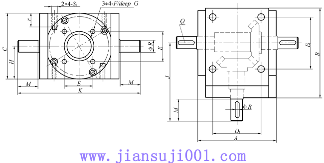 根據(jù)要求的工作方向確定輸入軸(蝸桿)的旋轉(zhuǎn)方向。蝸桿的旋轉(zhuǎn)方向與工作絲杠(或螺母)的伸縮方向類似于齒輪和齒條的關(guān)系,具體如“表CS3-6、聯(lián)接尺寸表-A型結(jié)構(gòu)”的示意圖中的箭頭所示。如多臺組合使用,還需注意傘齒輪箱的旋轉(zhuǎn)方向。